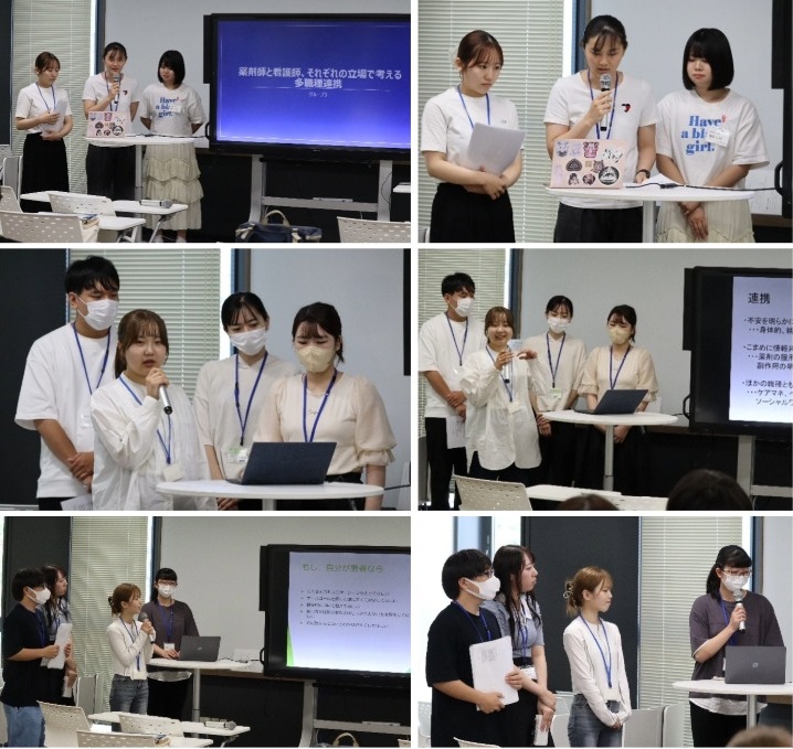 今回のワークショップ薬学部5回生、看護学部4回生ということもあり、それぞれ実習を経験している学生たちなので、理解の深い、いろんな角度から患者さんに寄り添った考察となりました。薬剤師・看護師という各役割分担を認識することができ、それぞれの立場で考えることにより、連携することの大切さ、チーム医療の重要性を考える良い機会となったのではないかと思います。