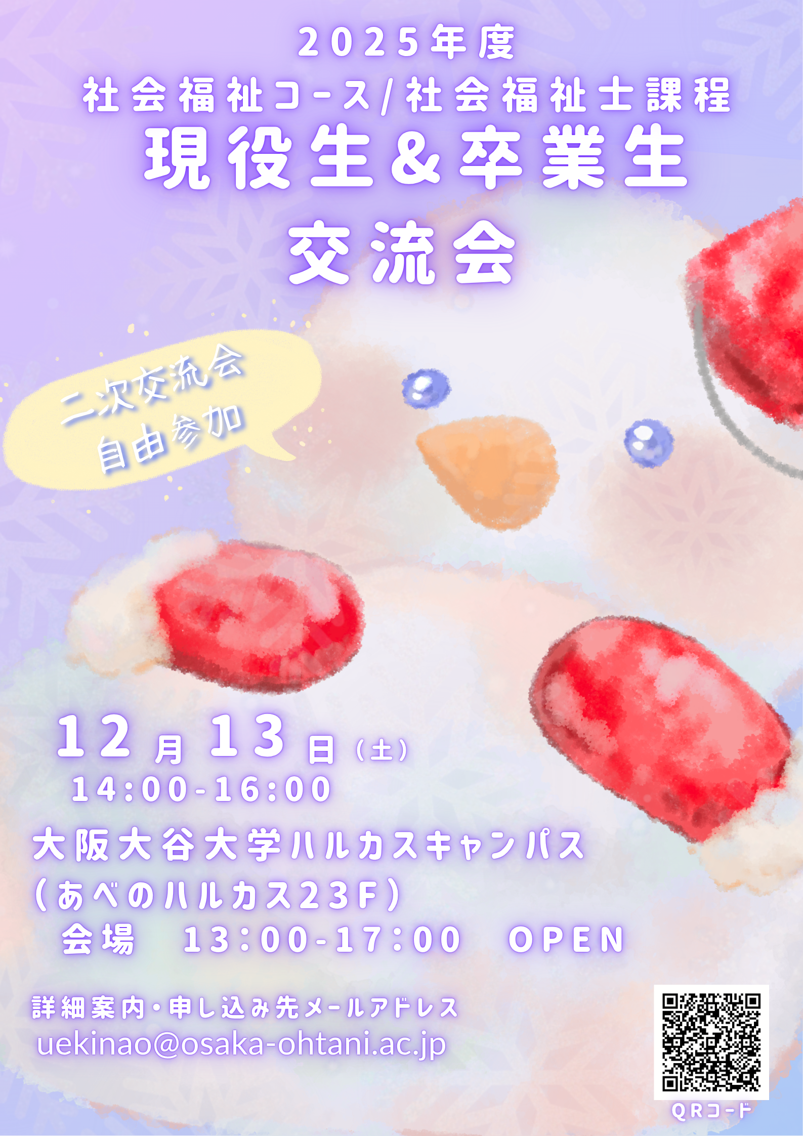 2025年度 大阪大谷大学社会福祉士課程 卒業生・現役生交流会を開催します。 奮ってお誘いあわせのうえ、ご参加いただけますと幸いです。
