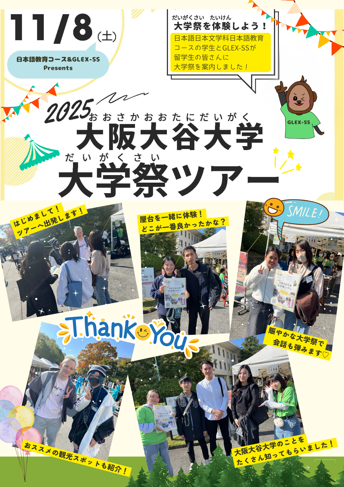 国際教育交流センター(GLEX)では、今年度初めての試みとして、大阪大谷大学で日本語教育を学んでいる学生が、日本語学校で学ぶ留学生の方に大学祭をご案内するイベントを企画しました!