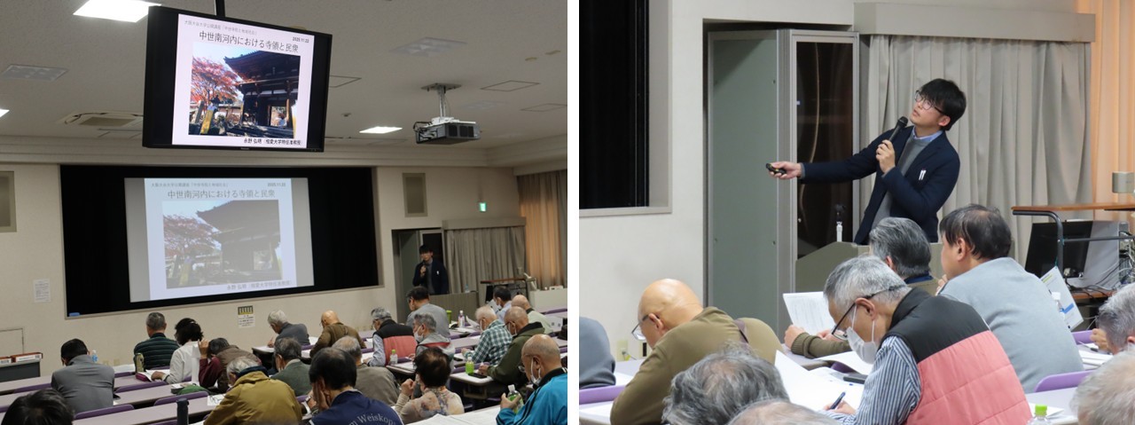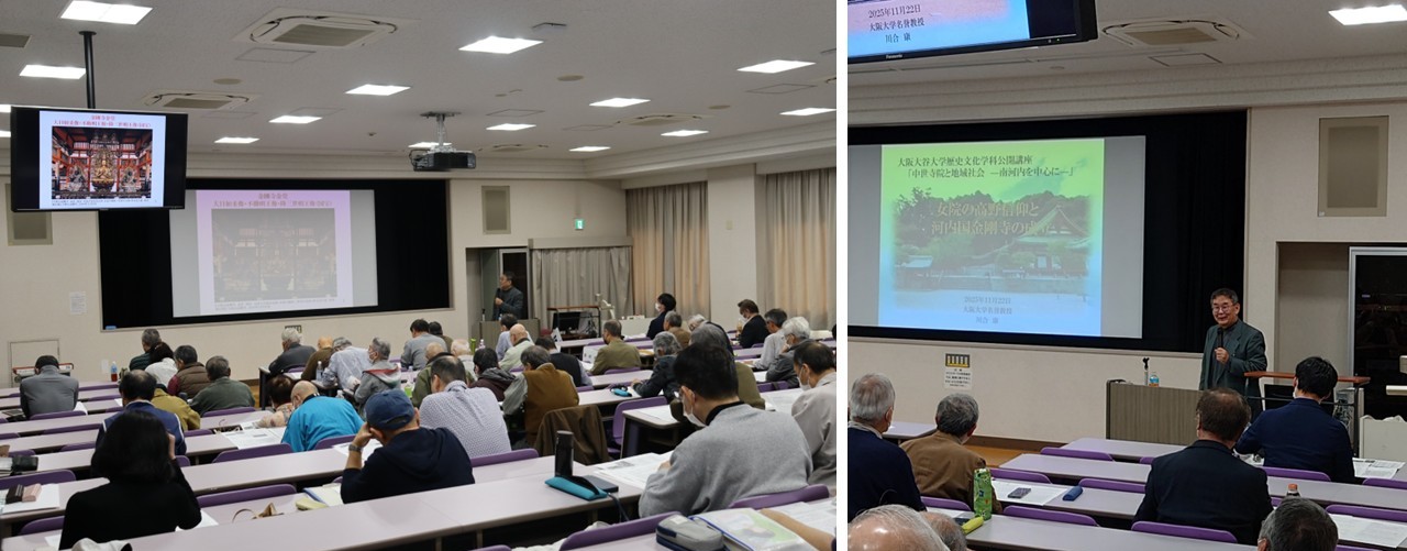 11月22日(土)、本学博物館にて公開講座「中世寺院と地域社会-南河内を中心に-」を開催しました。中世日本では寺院が社会の中心的な存在の1つでした。今回の講座では河内長野の古刹・金剛寺を中心に、女院や信仰、寺領、民衆、商人などの様々な切り口で寺院と地域社会の関係に迫りました。