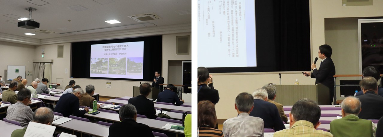 最後に本学の伊藤大貴講師が「戦国期南河内の寺院と商人」というテーマで講演しました。金剛寺文書に登場する硯屋宗悦という商人にスポットを当て、金剛寺にて調査した新出史料などをもとに彼の素性や人脈、金剛寺との関係を概説しました。