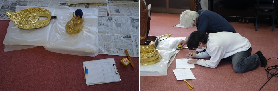 授業では、教室の中でレプリカを用いて仏像の計測等を学んでいるのですが、現場で本物の仏像の法量を測り、扱い方を教わりながら調書の記入や撮影補助を行う経験は、なかなかできることではありません。参加した学生は「楽しかった」そうです。