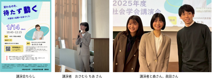 そのような学会の取組の一環として,2025年度は,2026年1月14日,本学内の教室において,「変わるのを待たずに,動く ―不登校×起業×社会づくり―」と題し,おさむら ちあ 氏の講演会を開催しました。