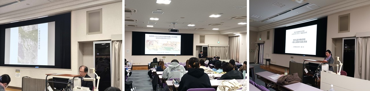今回は、犬木努教授が「大阪府一須賀D9号墳測量調査」、伊藤大貴専任講師が「夏期古文書調査について」、そして高志緑専任講師が「和泉市美術工芸品調査について」と題した報告を行いました。今年度も学生が熱心に調査に参加し、教員や専門家の指導のもと、貴重な史資料の扱い方や調査方法を学んだことがうかがえました。