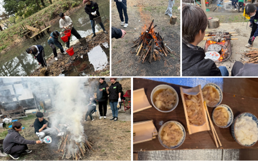 そのため、今年度も、ゼミエクスカージョンを行ない、4月のゼミが始まる前にチームビルディングを行ないました。具体的には、千早赤阪村で自然を活かした子どもの居場所活動を行なっておられる結の里で、ため池の底にたまった土砂をとるボランティアを行なったり、みんなで一緒に食事をつくったりしました。スコップで土砂をすくい、バケツリレーで土砂を運ぶ。薪を拾い、火を起こし、竹を切ってお皿や箸をつくる。マシュマロを焼き、タンドリーチキンや肉じゃがをつくり、ご飯を炊く・・・自然に会話と笑い声が起きていきます。