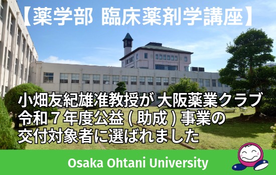 【薬学部 臨床薬剤学講座】小畑友紀雄准教授が 大阪薬業クラブ 令和7年度公益(助成)事業の交付対象者に選ばれました