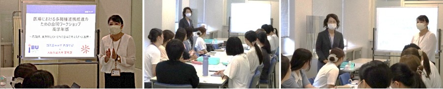 最初に四天王寺大学看護学部長の山崎尚美先生よりご挨拶を頂戴し、次に大阪大谷大学薬学部薬学科浦嶋庸子講師より、本日のワークショップのねらい、課題内容の説明のあと、アイスブレイクとして、10分間で、自己紹介をし、各学部に進学した理由など、お互いを知るところから始めました。