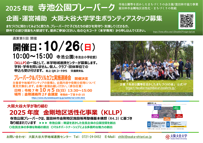 本学が、KLLP(金剛地区活性化プロジェクト)の一環として参加する寺池公園プレーパークが、今年も開催されます。これにあたり、本学では、この取組をサポートしてくださる学生ボランティアを募集します。
