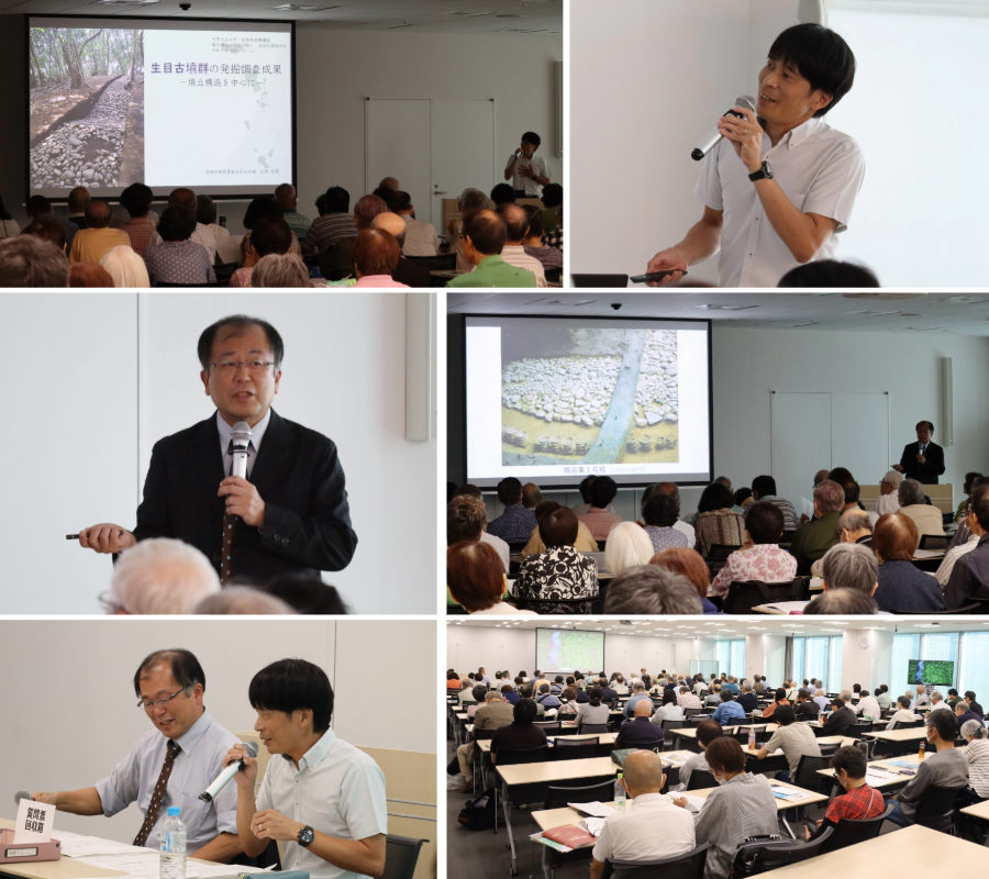 第1部では、宮崎市教育委員会文化財課主査の石村友規講師より「生目古墳群の発掘調査成果―墳丘構造を中心に―」と題して、生目古墳群における発掘調査成果や最新の研究成果についてご講演いただきました。生目古墳群に所在する主要な前方後円墳について、築造の年代順に概要や特徴をご紹介いただきました。