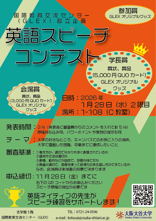 今年度、国際教育交流センター設立記念企画として、英語スピーチコンテストを開催します。 英語学習の一環として、学生の皆さんが挑戦できる貴重な機会です。 学生のうちにしかできないので、ぜひこの機会に挑戦してください。 英語に不安がある方もご安心ください。 国際教育交流センターが英語のサポートを行いますので、どなたでも安心して参加できます。