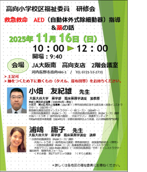 11月6日(土)JA大阪南 高向支店で実施された河内長野市高向小学校区福祉委員会研修会において、本学薬学部 小畑友紀雄准教授、浦嶋庸子講師による、「救急救命AED指導&薬の話」をテーマとする研修会が行われました。